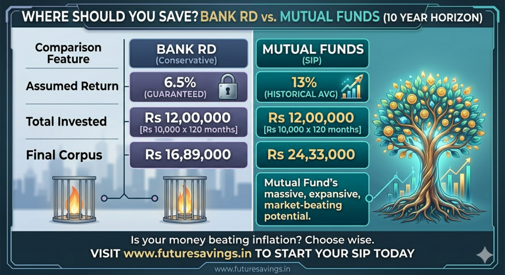 Note: Mutual fund returns are subject to market risks and are not guaranteed like RDs. However, historically, diversified equity funds in India have delivered 12-15% over long horizons.